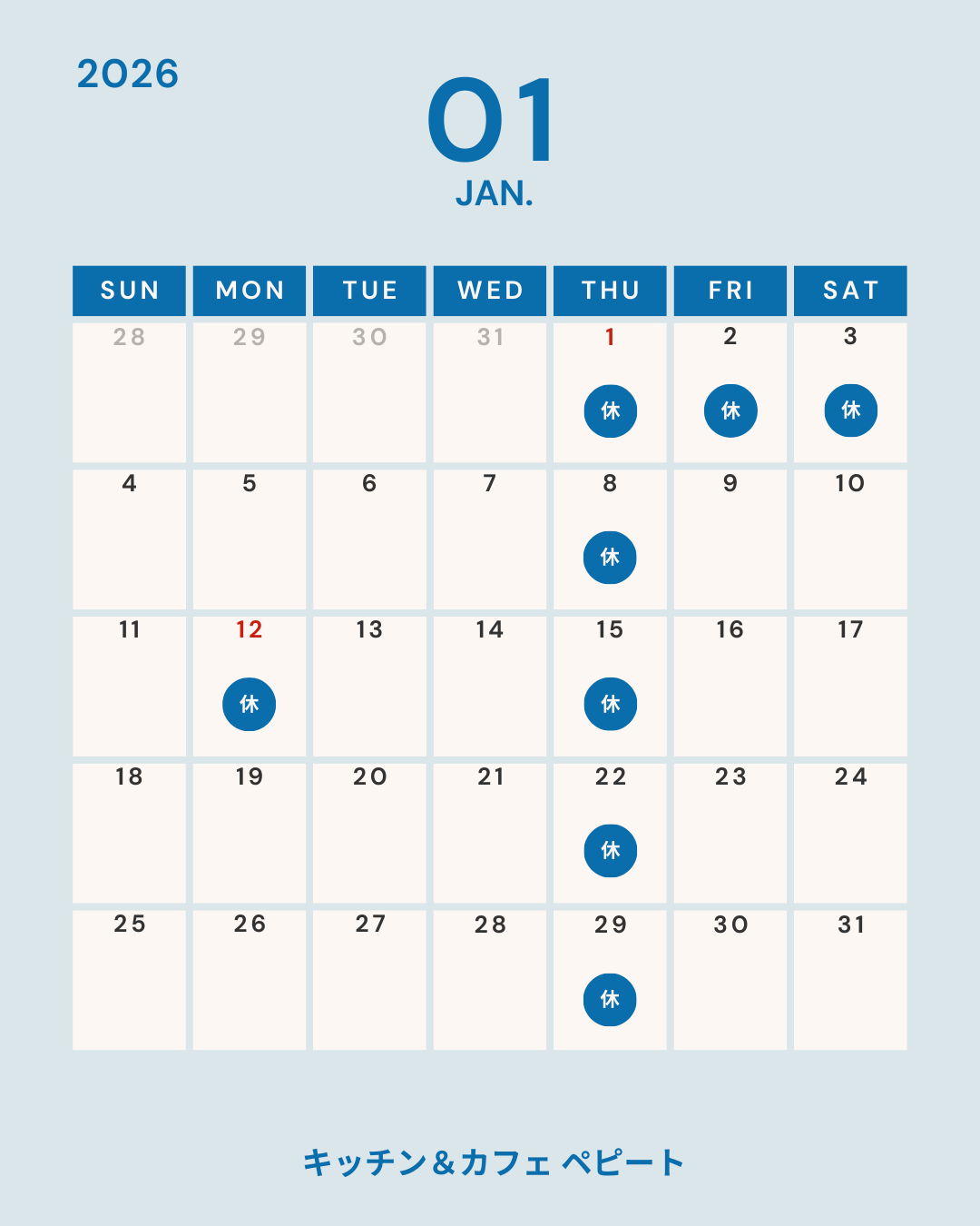 【2026年1月】営業カレンダー 2026.01.03記事内に広告が含まれています。 ・当面のあいだ、突発的なお休みが出る可能性があります。・夜の営業(17:30~)は休止中。お手数ですが、お電話で確認していただけると確実です。ご心配・ご迷惑おかけしますが、どうぞよろしくお願いいたします🙂↕️⋆꙳